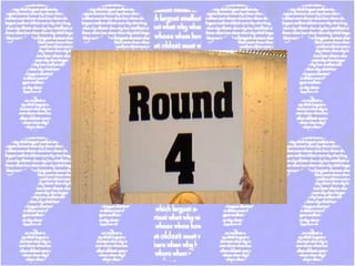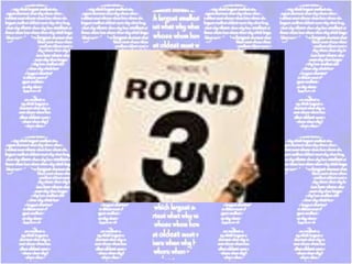 This document outlines the structure and format of a general knowledge quiz competition involving multiple rounds: a written round with 5 questions worth 5 marks each for a total of 25 marks, with a full house bonus of 5 extra marks; an infinite bounce round with 20 questions worth 10 marks each where teams can choose to answer directly or bounce questions to other teams; and a theme round where clues are given about a theme and teams can attempt to answer after each clue for varying point values. The rounds cover topics in history, arts, science, pop culture and current events.