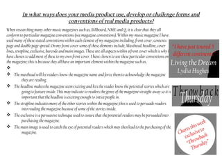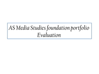 The document discusses the author's media studies foundation portfolio evaluation. It summarizes how the author's music magazine uses conventions from real music magazines in its design elements like the front cover, contents page, and double page spread. It discusses the use of masthead, headlines, images, page numbers, and more and how they conform to magazine conventions. It also discusses how the magazine represents its target audience of 16-25 year olds through the model, language, topics covered, and more.