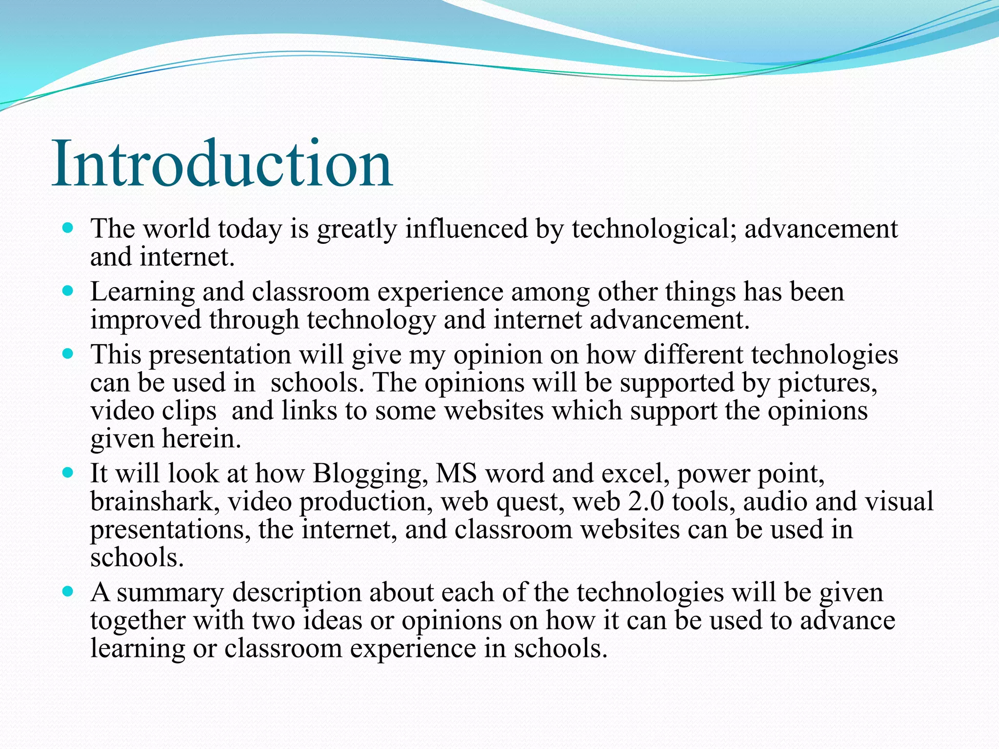This document discusses how various technologies can be used in schools to improve learning and classroom experiences. It describes how blogs, MS Word, Excel, PowerPoint, Brainshark, web 2.0 tools, audio/visual presentations, the internet, video production, classroom websites, and webquests can be implemented. For each technology, one or two examples are provided for how they can be used by teachers and students to enhance learning, engagement, and access to resources and materials.