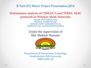 This document summarizes a project presentation on analyzing the performance of CSMA/CA and TDMA MAC protocols in wireless mesh networks. It first provides background on wireless mesh networks and describes their architecture and characteristics. It then discusses CSMA/CA and TDMA protocols and how they work. The project involved simulating a wireless mesh network topology using NS-2 and evaluating the performance of the two protocols based on metrics like throughput, delay, and packet loss under varying conditions like number of hops and link distance. The results showed that TDMA performance was better than CSMA/CA. The conclusion recommends further analysis using directional antennas.