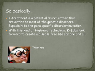 This document summarizes multi-system genetic disorder called Tuberous sclerosis which affects multiple organs including the brain, kidneys, and skin. It causes benign tumors and affects around 1 in 6,000 newborns. Symptoms include seizures, developmental delays, skin abnormalities, and diseases of the lungs, kidneys, heart and eyes. The disorder is caused by mutations in tumor suppressor genes TSC1 and TSC2, which normally repress the mTOR pathway and prevent tumor growth. While rapamycin can partially suppress mTOR hyperactivity caused by TSC mutations, there are no approved drugs for the disorder. The document also describes a potential nanotechnology approach using a viral robot to deliver healthy TSC genes as a