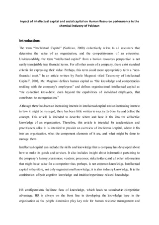 - The document discusses the impact of intellectual capital and social capital on human resource performance in the chemical industry of Pakistan. It provides background on intellectual capital and defines it as the collective knowledge and competencies within an organization.