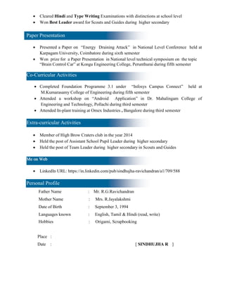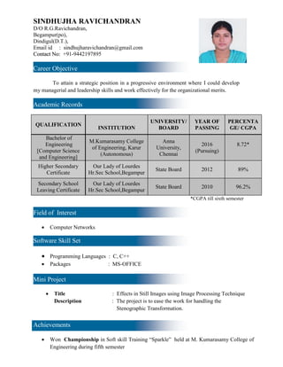Sindhujha Ravichandran is seeking a strategic position to develop her managerial and leadership skills. She has a Bachelor of Engineering in Computer Science and Engineering from M. Kumarasamy College of Engineering with an 8.72 CGPA. Her academic qualifications include higher secondary and secondary school certificates with scores of 89% and 96.2% respectively. Her areas of interest are computer networks and software skills include programming languages C and C++. She has participated in various projects, competitions, and training programs.