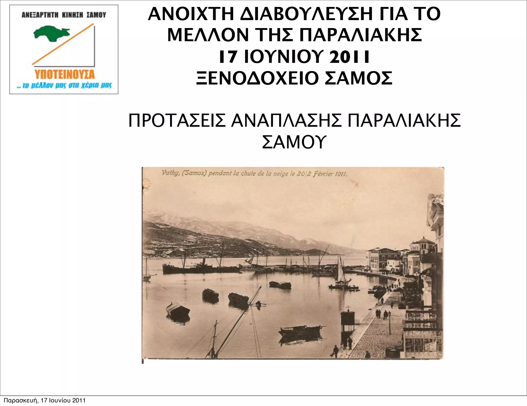 Η Παρουσίαση της ΥΠΟΤΕΙΝΟΥΣΑΣ στην Ανοιχτή διαβούλευση για την παραλιακή ΣΑΜΟΥ. Παρουσιάστηκαν μελέτες, προτάσεις και η μελέτη που φαίνεται να προκρίνεται απο τις αρχές για υλοποίηση και παρά το κοινό αίσθημα για αλλαγές στην παραλιακή, διατηρεί την υπάρχουσα κατάσταση!. Εποικοδομητική συζήτηση αν και ξεκάθαρες απαντήσεις στο ερώτημα "Γιατί κάνετε νέα μελέτη και διατηρείται το κατα μήκος πάρκινγκ και τις ίδιες λωρίδες κυκλοφορίας, όταν το επιχειρησιακό σχέδιο του Λιμενικού Ταμείου προβλέπει κατάργηση του μήκους πάρκινγκ και μείωση του πλάτους των λωρίδων", δεν δόθηκαν.