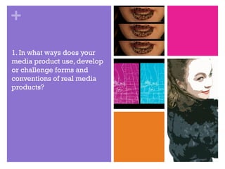 The document discusses how a student evaluated their music video project by addressing how it used conventions of real music videos, how effective the combination of the music video and supplementary materials like a digipak and poster were, and what was learned from audience feedback during two screenings of the video. The student aimed to include typical elements of dance music videos in their work and received feedback on parts that needed further development after the first screening.