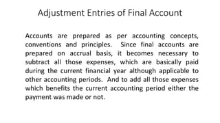 The document discusses the preparation of final accounts, focusing on necessary adjustments to ensure accurate profit and loss reporting, including treatment of closing stock, depreciation, bad debts, outstanding and prepaid expenses, and accrued income. It emphasizes that these adjustments align with accounting principles and conventions to accurately reflect the financial position of a business. Additionally, it highlights specific accounting treatments for various elements that can affect financial statements.