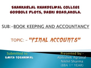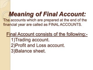 The document discusses final accounts, which are prepared at the end of the financial year and include the trading account, profit and loss account, and balance sheet.