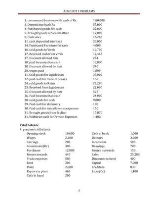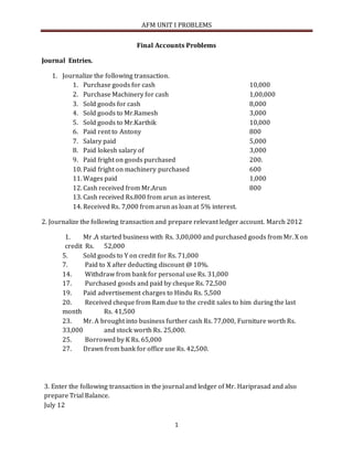 1. The document provides journal entry problems and instructions to prepare ledger accounts, trading and profit and loss accounts, and trial balances from transaction details and trial balance figures provided.