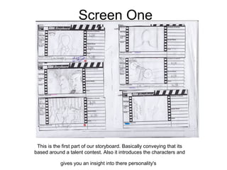 This document presents the final adapted storyboard for a new plot using shots from the original storyboard. The new narrative relates to the old one, making it easier to recreate. The storyboard introduces characters for a talent contest and conveys how contestants harm themselves for fame. It highlights murders and disruptions as deaths become more frequent. Later screens show more of the killer and connections between the motive and contestants' personal issues, reinforcing the film's themes. The last screen provides credits and release information.