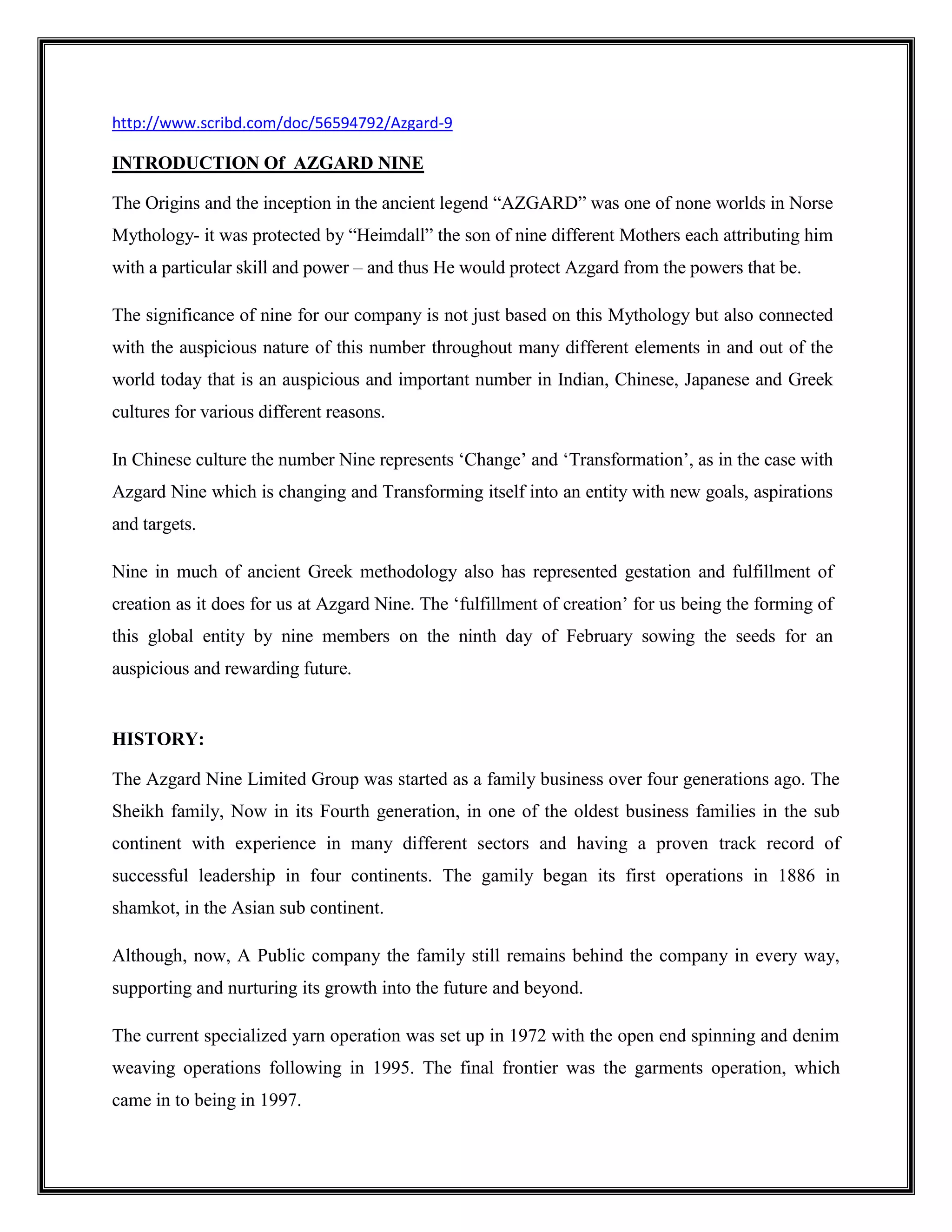 The document provides background information on Azgard Nine, a textile company based in Pakistan. Some key points: