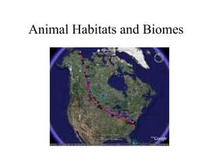 This document provides information about various animal habitats, adaptations, and migrations. It discusses the tundra biome and some of its characteristics. Facts are provided about deciduous forests, rainforests, grasslands, deserts, and water biomes. The document also covers different animal adaptations like physical adaptations, behavioral adaptations, mimicry, avoidance, special mouth parts, escape techniques, protective coloration, and more. Specific examples of animal migrations are described, including wildebeest, gray whales, sandhill cranes, monarch butterflies, and tundra swans. Their migration routes and purposes are summarized.
