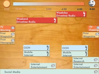 Arby's is developing a new branding initiative to grow its core audience and become more competitive. It is considering targeting an audience of 68 million adults aged 35-54 who value quality, health, and family. The document outlines strategies and tactics for reaching this target audience across various media channels, including TV, radio, print, internet, and out of home advertising. Key tactics include radio ads during weekday and weekend drive times, magazine ads in titles related to health and home, and video ads on YouTube and Hulu.