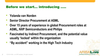 The document outlines ASML's procurement transformation journey led by Yolanda van Norden, highlighting the shift from fragmented indirect procurement strategies to a high-performance procurement organization focused on delivering measurable value. Key actions included setting up cross-functional teams, enhancing alignment with business needs, and implementing streamlined processes and technology. The results showed significant improvements in savings, spend management, and process efficiency, marking the successful adoption of a new procurement approach.