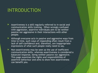The document discusses assertiveness as a vital communication skill that balances standing up for personal rights while respecting others' needs. It defines various communication styles, including passive, aggressive, and assertive, highlighting the characteristics and benefits of assertive behavior such as increased self-confidence and improved relationships. Additionally, it offers techniques for developing assertiveness, the importance of assertiveness in organizations, and the role of assertiveness training in overcoming anxiety.