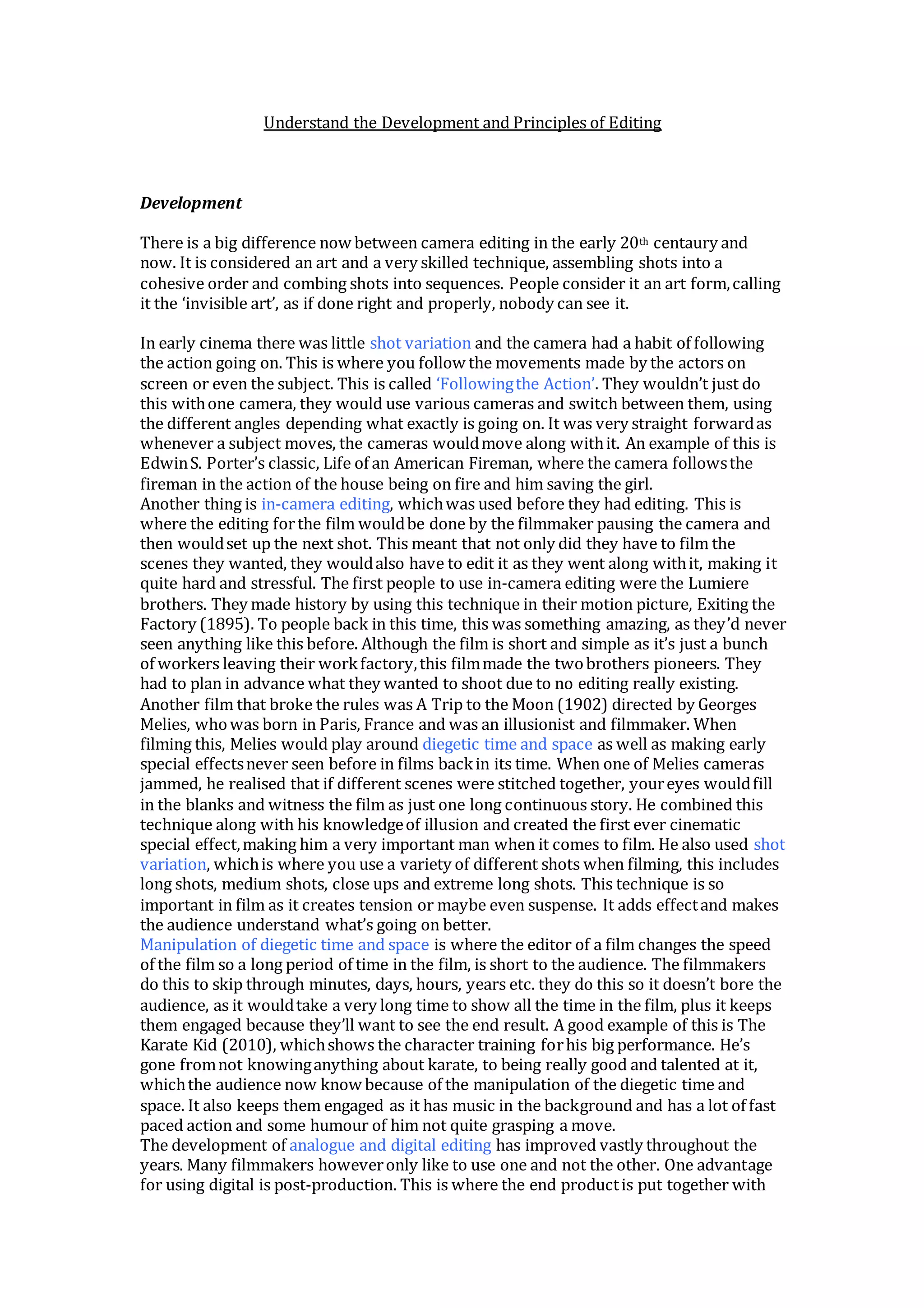 Editing has developed significantly from the early 20th century. Early films used techniques like following the action, in-camera editing, and shot variation. Over time, editors gained more control over shaping stories. Modern editing employs various conventions like seamless cuts, continuity, motivated shots, and montages to engage audiences. Techniques like pace, information provision, and rhythm influence how audiences feel and understand films.