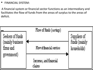 The document summarizes the financial system in India. It discusses the various components of the Indian financial system including banking, insurance, capital markets, and regulatory authorities. It notes that the Reserve Bank of India acts as the central bank and regulates the banking sector, foreign exchange, and payment systems. It also discusses the roles and functions of financial institutions and markets in facilitating the flow of funds from surplus to deficit areas. The reforms of the financial system in the 1990s aimed to make the system more competitive, transparent, and resilient by increasing privatization, deregulation, and improving regulations.