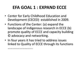 The document summarizes initiatives by the Center for Early Childhood Education and Development (CECED) in India to achieve Education for All goals. CECED conducts research on early childhood education, provides quality promotion and capacity building support to states, and engages in advocacy and networking. Some of CECED's research includes longitudinal mixed-method studies and case studies on good practices. CECED also works to develop early learning standards and professional development programs for community workers. Challenges faced by CECED include dependence on external funding and balancing research, teaching and administrative functions with its project-based work.