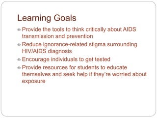 The document provides guidance for individuals diagnosed with HIV/AIDS on how to live with their diagnosis. It discusses the need for lifestyle changes like improved nutrition, exercise and safer sex practices. It also emphasizes the importance of communicating one's status to close relationships and seeking counseling to cope with potential depression and stigma. Support groups and healthcare services are recommended to help patients manage their condition and quality of life.