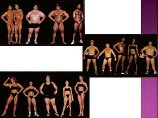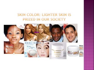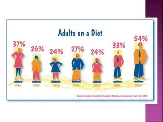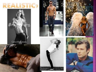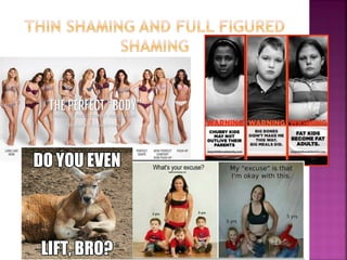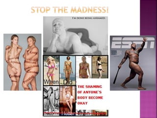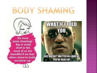This document summarizes issues related to body image standards and eating disorders. It discusses how media portrayals of beauty influence self-esteem and perpetuate stereotypes. Unrealistic societal standards exist for things like hair, skin, weight and age. Eating disorders like anorexia, bulimia and binge eating disorder are influenced by predisposing personality traits and life events, but coping skills determine who develops a disorder. Resources for support are provided.