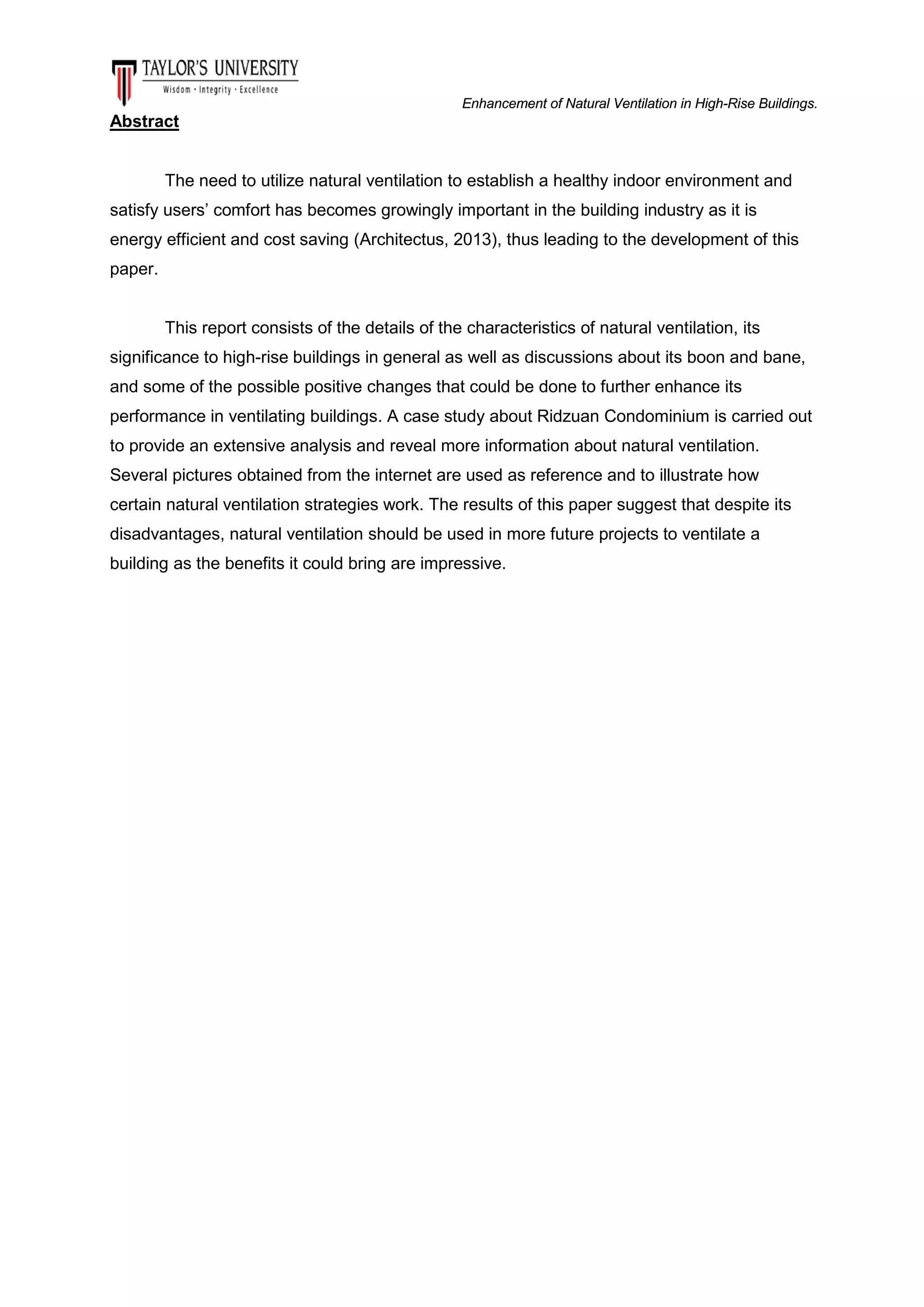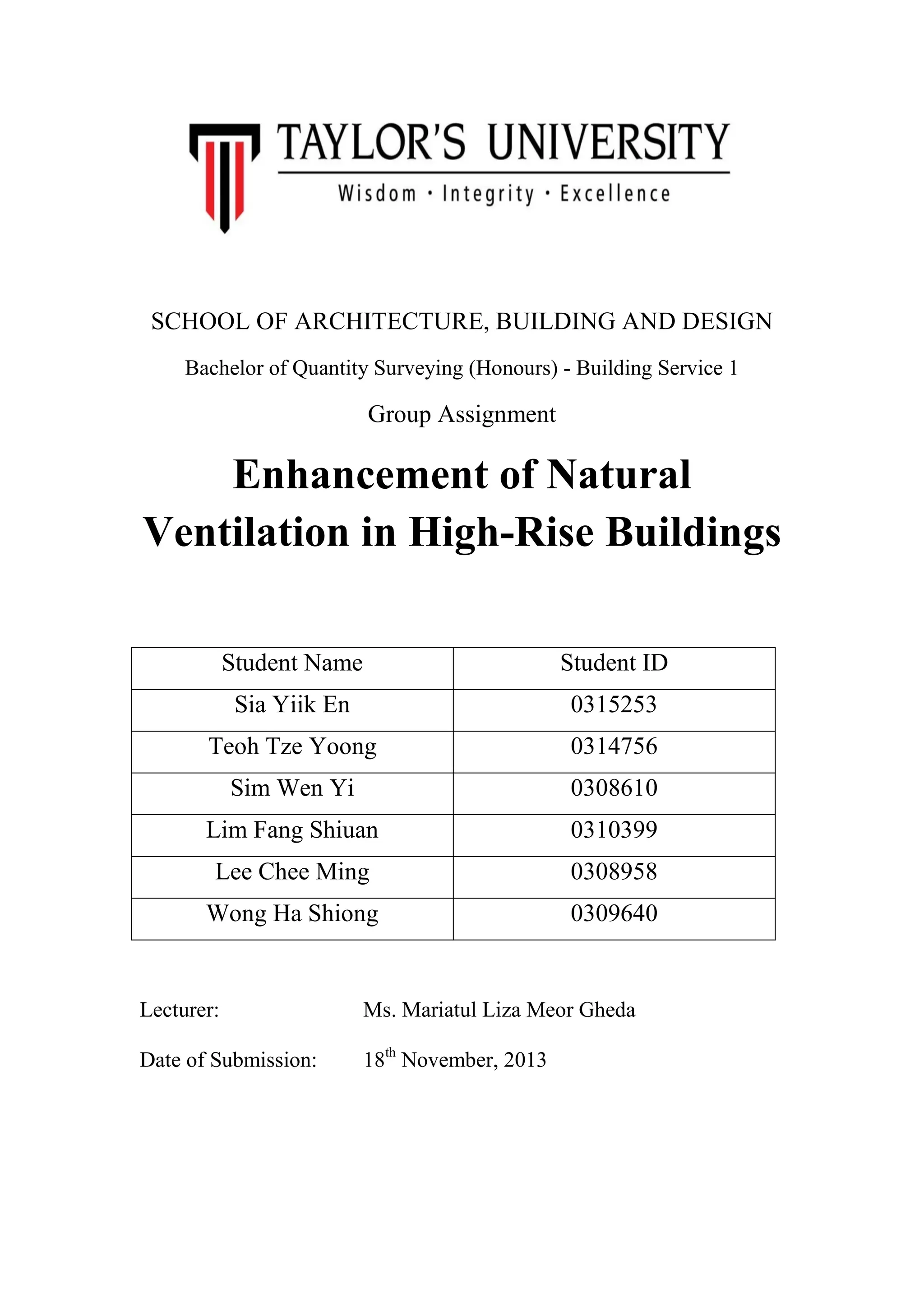 This document is a group assignment report on enhancing natural ventilation in high-rise buildings. It includes an abstract, table of contents, and 5 chapters that discuss the history, theory, case study, conclusion, and learning outcomes of the project. The case study analyzes the natural ventilation strategies used at Ridzuan Condominium in Kuala Lumpur, Malaysia. It examines the building's ventilation systems, strengths, considerations, and recommendations for improvement. The report ultimately concludes that natural ventilation should be utilized more in future high-rise projects due to its benefits, despite some disadvantages.