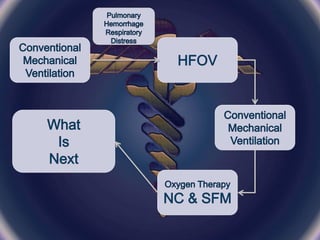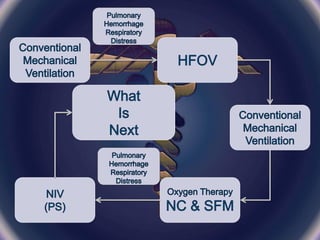 - Various ventilation modes were trialed, including PCV, HFOV, PSV and NIV. Weaning attempts were made but oxygen requirements increased, requiring reintubation. Bilateral infiltrates were seen on chest x-rays.