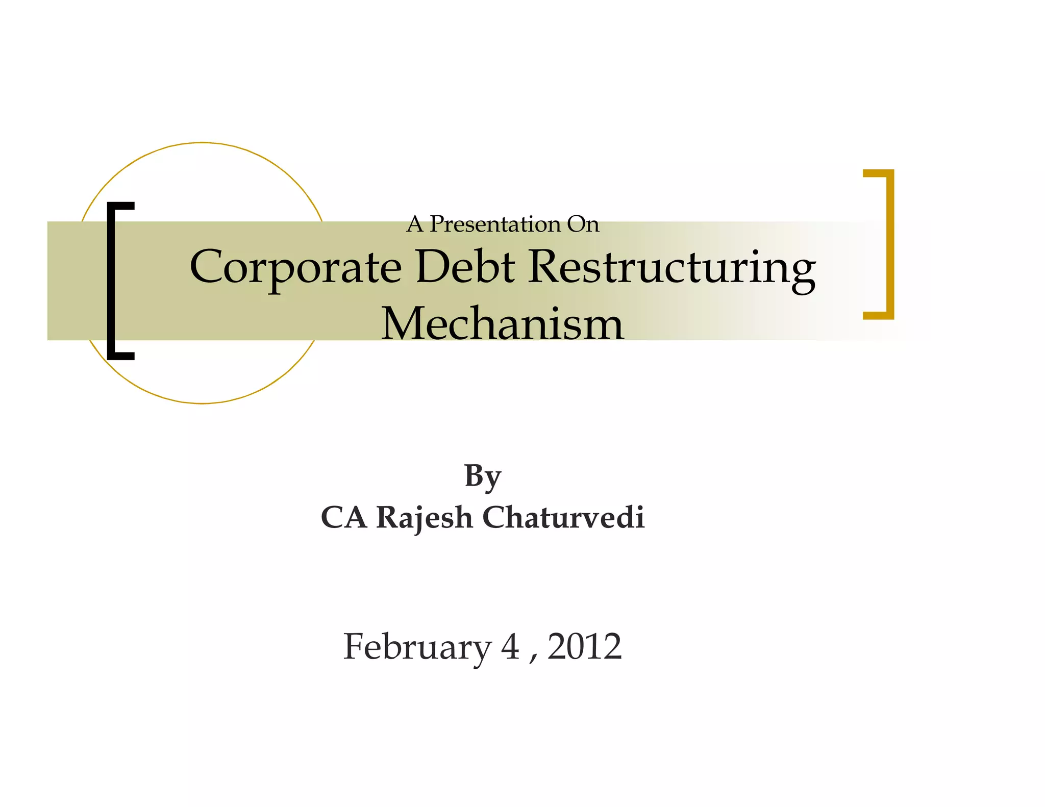 The document discusses corporate debt restructuring (CDR) in India, including what CDR is, why companies pursue it, the CDR structure, legal basis, objectives, and case studies of companies that underwent CDR including KSL Industries and Kingfisher Airlines. It provides an overview of the key mechanisms and considerations for corporate debt restructuring in India.