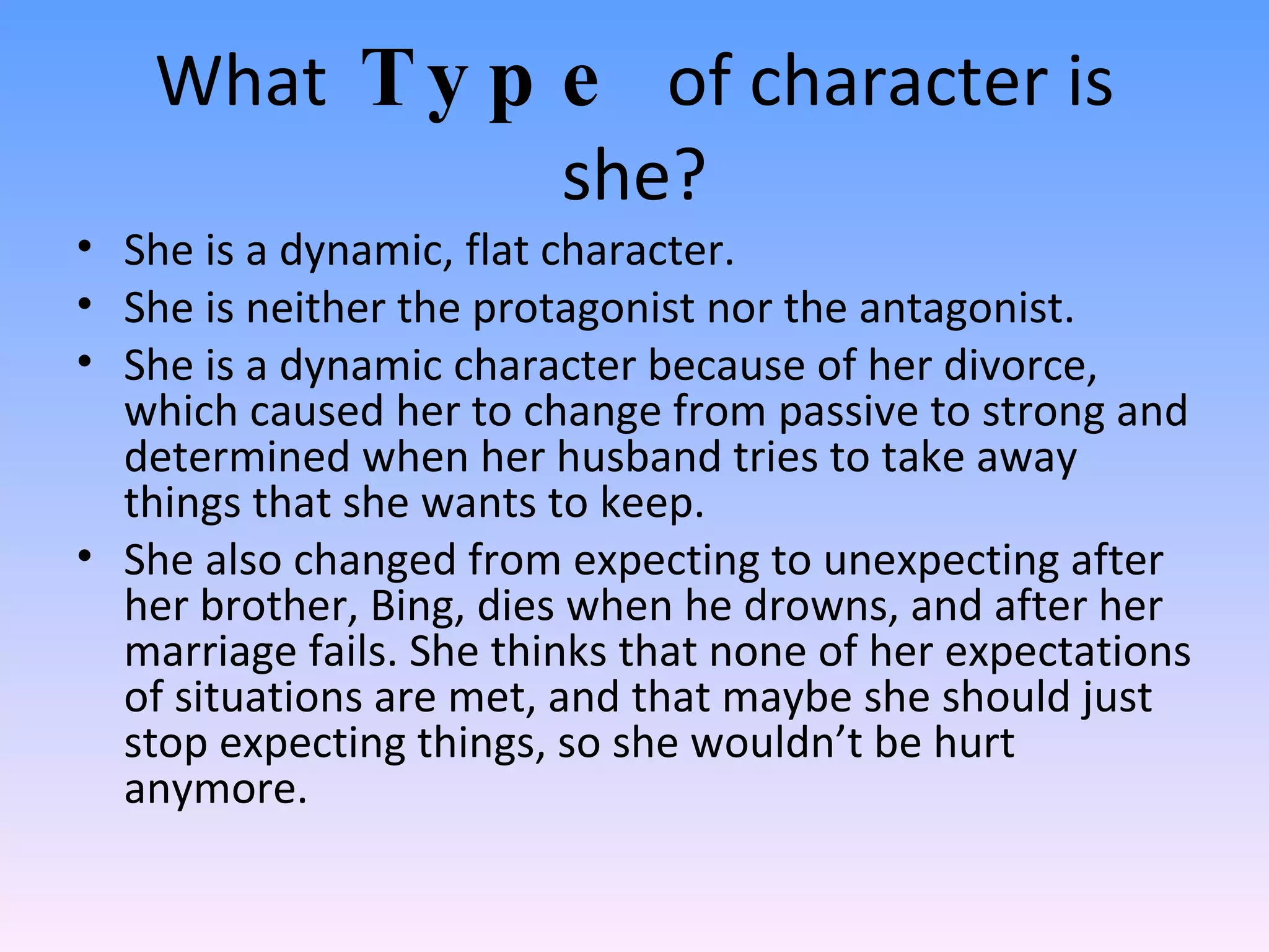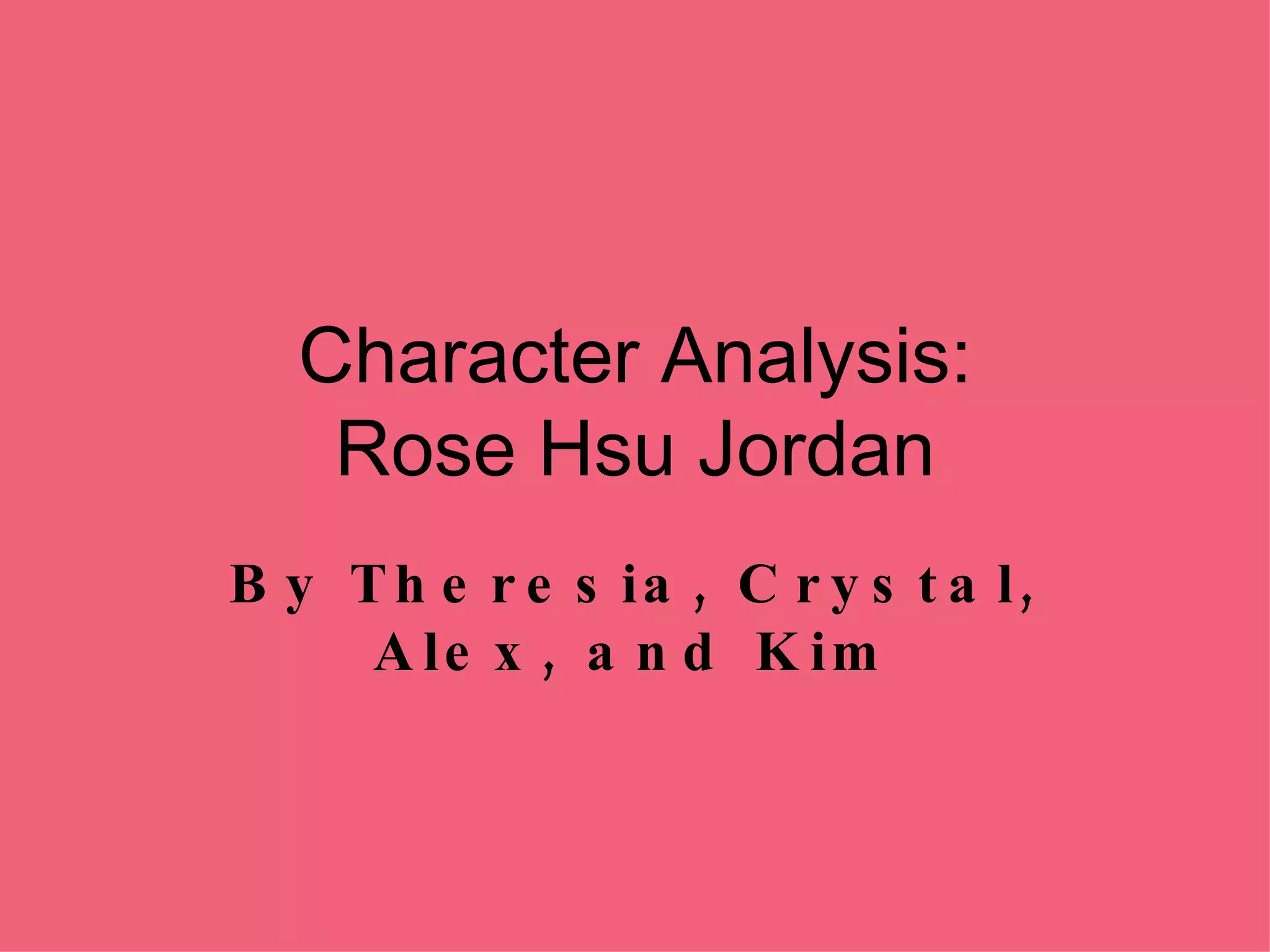 Rose Hsu Jordan is a dynamic but flat character in the story. She is neither the protagonist nor antagonist. She experiences significant changes from being passive to strong and determined after her divorce from her husband Ted Jordan. She also changes from being expecting to unexpecting after the death of her brother Bing and the failure of her marriage. Rose has little self-confidence at first and tends to go along with what others want but gains more confidence later when she stands up to her husband to keep their house. She has external conflicts with Ted over the house and divorce, and internal conflicts over feeling responsible for her brother's death and the end of her marriage.