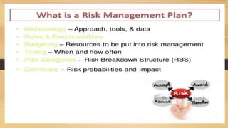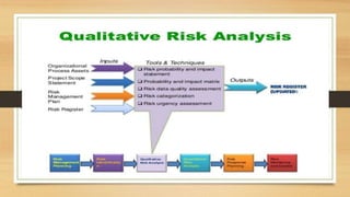 The document outlines the principles of project management in international relations, focusing on stakeholder identification, risk management processes, and the importance of proactive communication and planning. It discusses types of project risks, qualitative and quantitative analysis methods, and various response strategies for both negative and positive risks. Additionally, it highlights the benefits of effective risk management, the use of software tools, and the importance of a risk register for tracking and prioritizing risks.