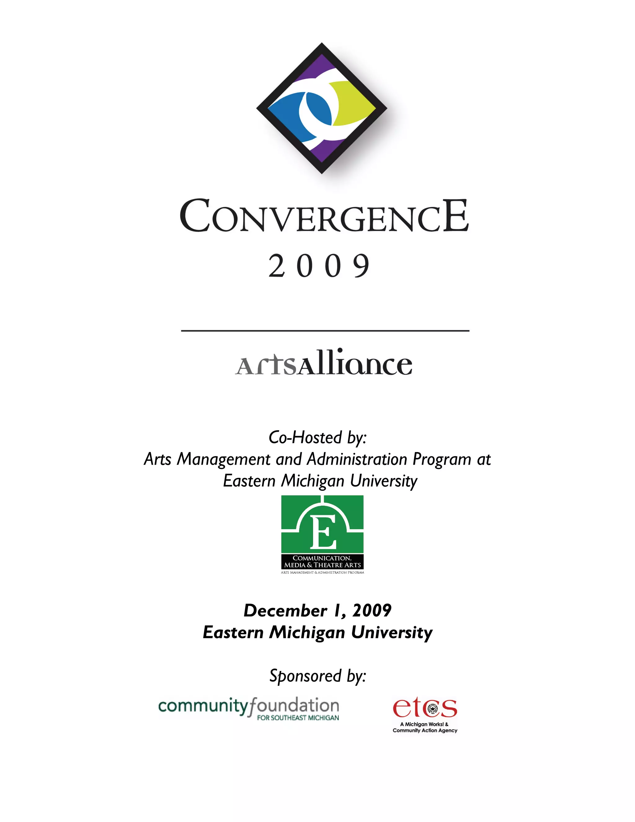 This document provides an agenda for an arts and cultural summit hosted by Eastern Michigan University on December 1, 2009. The summit included musical and dance performances, presentations from regional cultural leaders, breakout sessions on topics like arts education and creative use of space, a keynote speech from Stuart Rosenfeld on creative economies, and networking opportunities. Breakout sessions covered welcoming a new arts website, fundraising strategies, an art walk program, and using social media. The agenda provides details on session times and locations throughout the day-long event.