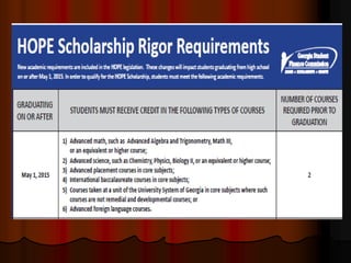 This document provides information for parents of the class of 2015 from Marietta High School regarding graduation requirements, upcoming course registration, dual enrollment opportunities, standardized testing dates, and important contact information. Students need a minimum of 23 total credits to graduate and must pass certain end of course tests. Parents and students can access course recommendations and registration through the ASPEN portal in March. The document also outlines eligibility for HOPE and Zell Miller scholarships as well as career pathways available at the high school.