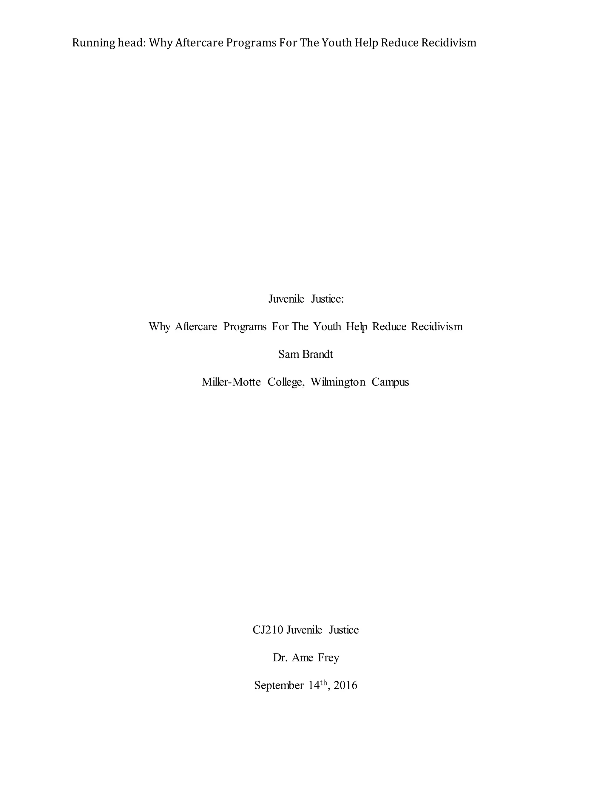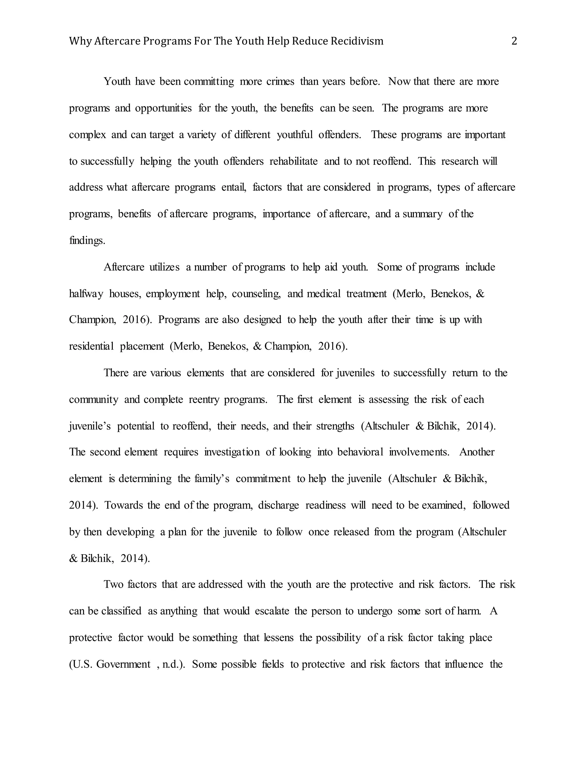 The document discusses the benefits of aftercare programs for juvenile offenders. It explains that aftercare programs utilize halfway houses, counseling, employment assistance, and other services to help juvenile offenders successfully reintegrate into the community after being released from residential placement. Research shows these programs reduce recidivism rates by providing offenders with support, skills, and positive environments needed to stay out of trouble. The document also outlines different types of aftercare programs, including foster homes, shelter care, group homes, and wilderness programs. It argues that aftercare should be emphasized over confinement, as it improves public safety and the long-term outcomes of juvenile offenders.