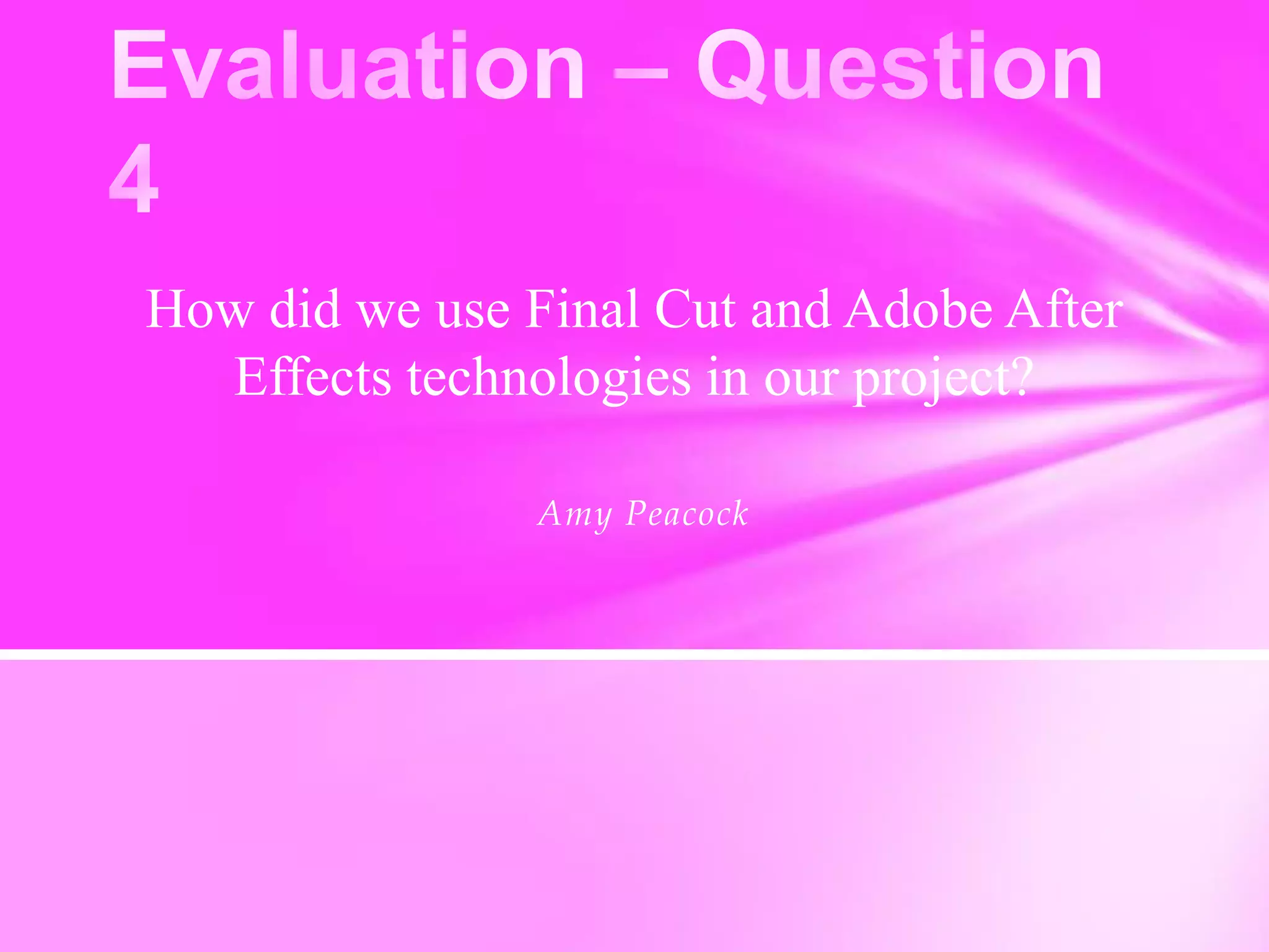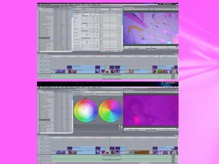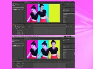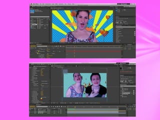 The document summarizes the use of various video editing techniques in a project using Final Cut Express and Adobe After Effects. Green screens were used throughout to add creative effects. One effect duplicated a person three times on screen with different colors. A lipstick animation added lipstick and fireworks bursting from clips. Transitions between clips used bright color dissolves to keep the video moving at a fast pace. A split screen effect synced four clips together with lips and eyes in different places to create a constantly changing transition. Color correction and dazzle effects were used but had to be adjusted to not make the subjects look too fake.