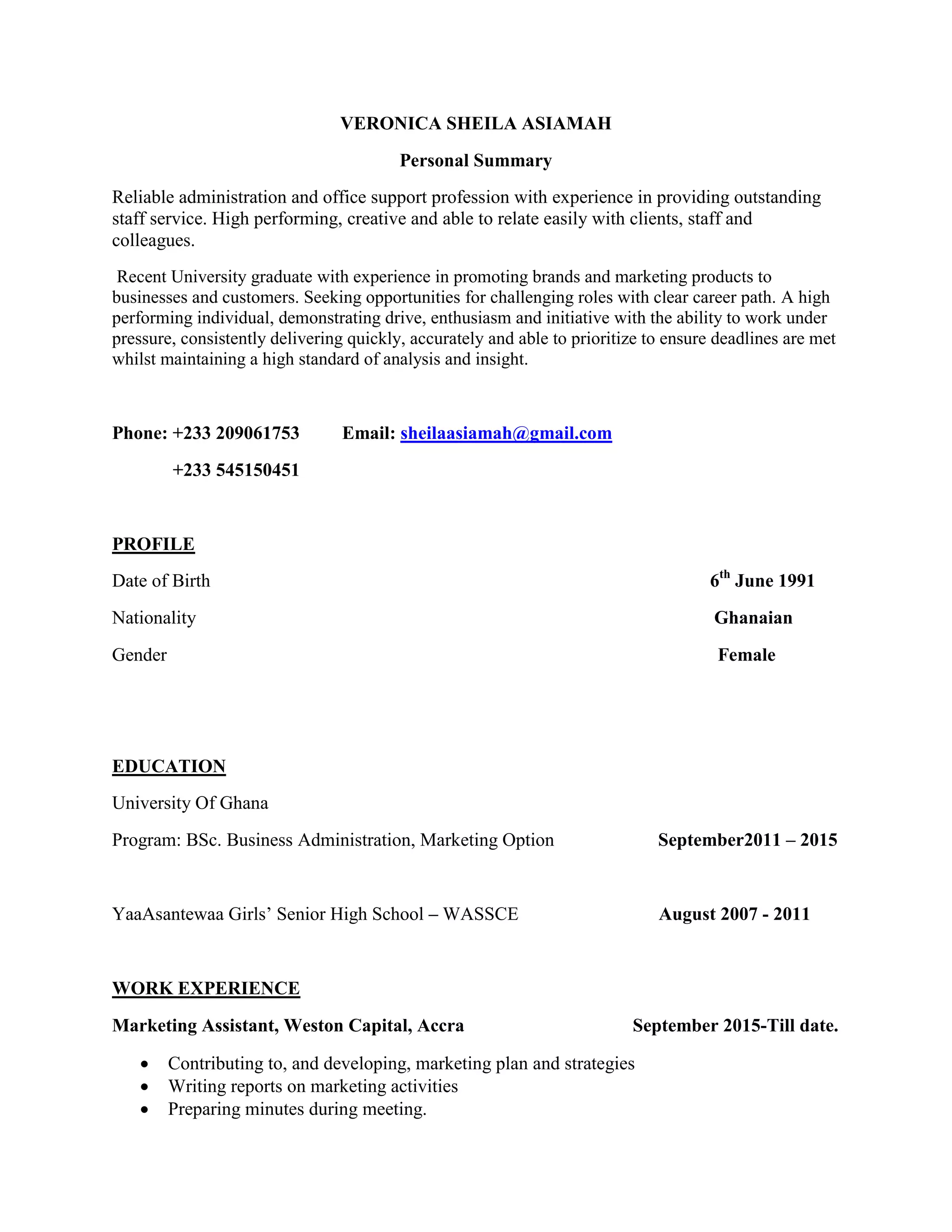 Veronica Sheila Asiamah is a recent university graduate seeking a challenging role. She has experience in marketing, administration, customer service, and entrepreneurship. Asiamah has strong communication, organizational, and problem-solving skills. Her work history includes positions in marketing, operations, and procurement. She is proficient in Microsoft Office applications and has leadership experience in university clubs and high school organizations.