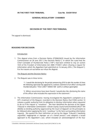 The first-tier tribunal dismissed the appeal regarding a Freedom of Information Act request made by the appellant to Humberside Police, determining the request to be vexatious under section 14(1) of the Act. The Information Commissioner found that the request imposed a considerable burden on the police and lacked significant public value. The tribunal's review concluded that the decision notice was lawful and dismissed the appeal unanimously.