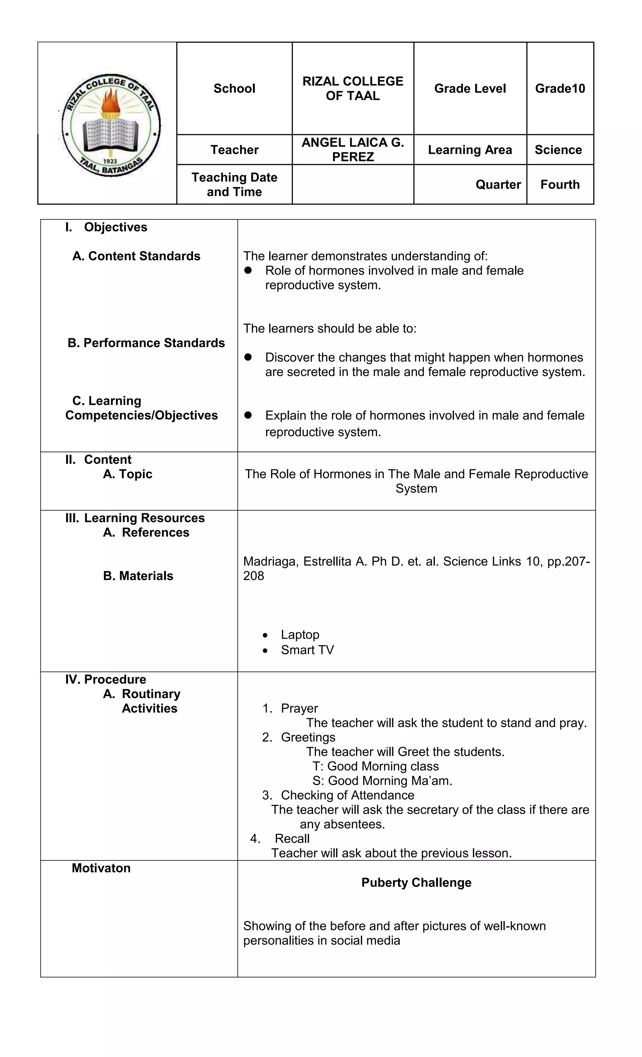This document outlines a lesson plan on the role of hormones in the male and female reproductive system. It includes objectives, content, learning resources, procedures, and assessment. The procedures involve motivating students by showing celebrity before/after photos from puberty. Students then guess who the celebrities are and analyze the physical changes. The teacher introduces hormones and their roles, including testosterone, estrogen, progesterone, and others. Students then identify and apply their understanding by naming changes that occur in males and females during puberty under the effects of different hormones.
