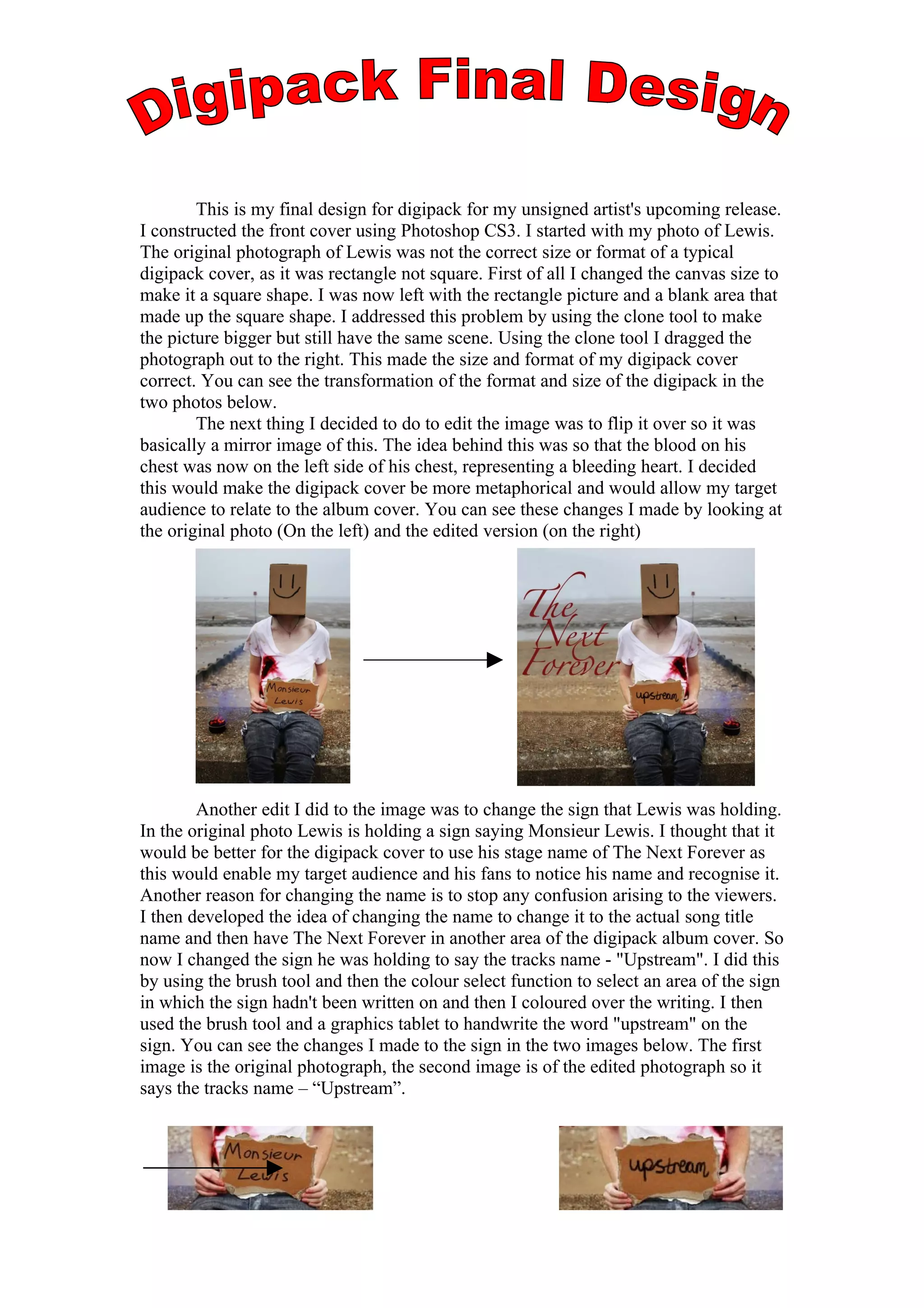 The document summarizes the design process for a digipack album cover. The designer edited photos in Photoshop to create the front and back covers. For the front, they resized a photo to fit the square format, flipped it, and changed the sign to say the song title. For the back, they adjusted colors and brightness, painted the sky to match the front, and added the track listing and artist information. The final design includes continuity across the front and back covers.
