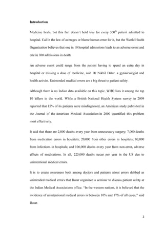 This document discusses medication errors that can occur in hospitals. It defines medication errors as any error in prescribing, dispensing, or administering drugs, regardless of whether harm occurs. Medication errors are a major cause of preventable patient harm. The document classifies medication errors as mistakes, slips, or lapses, depending on where the error occurs in the medication use process. It also discusses different ways medication errors have been estimated to cause deaths in other countries to highlight the significant impact of these errors.