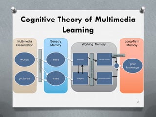 1) The document discusses how different multimedia design principles like modality, redundancy, and segmenting can affect the situational interest of adult learners.
