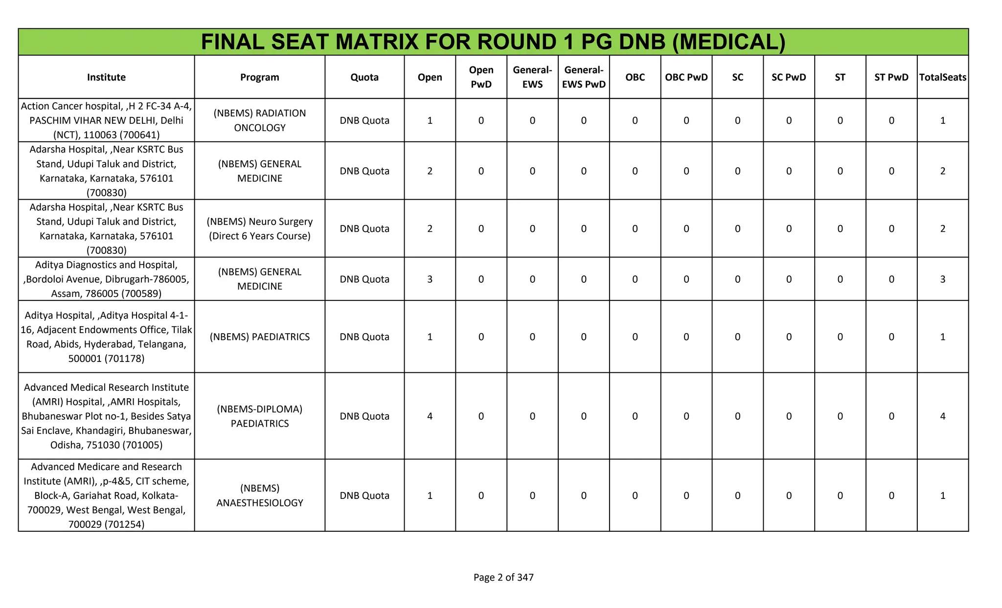FINAL SEAT MATRIX FOR ROUND 1 PG DNB (MEDICAL)