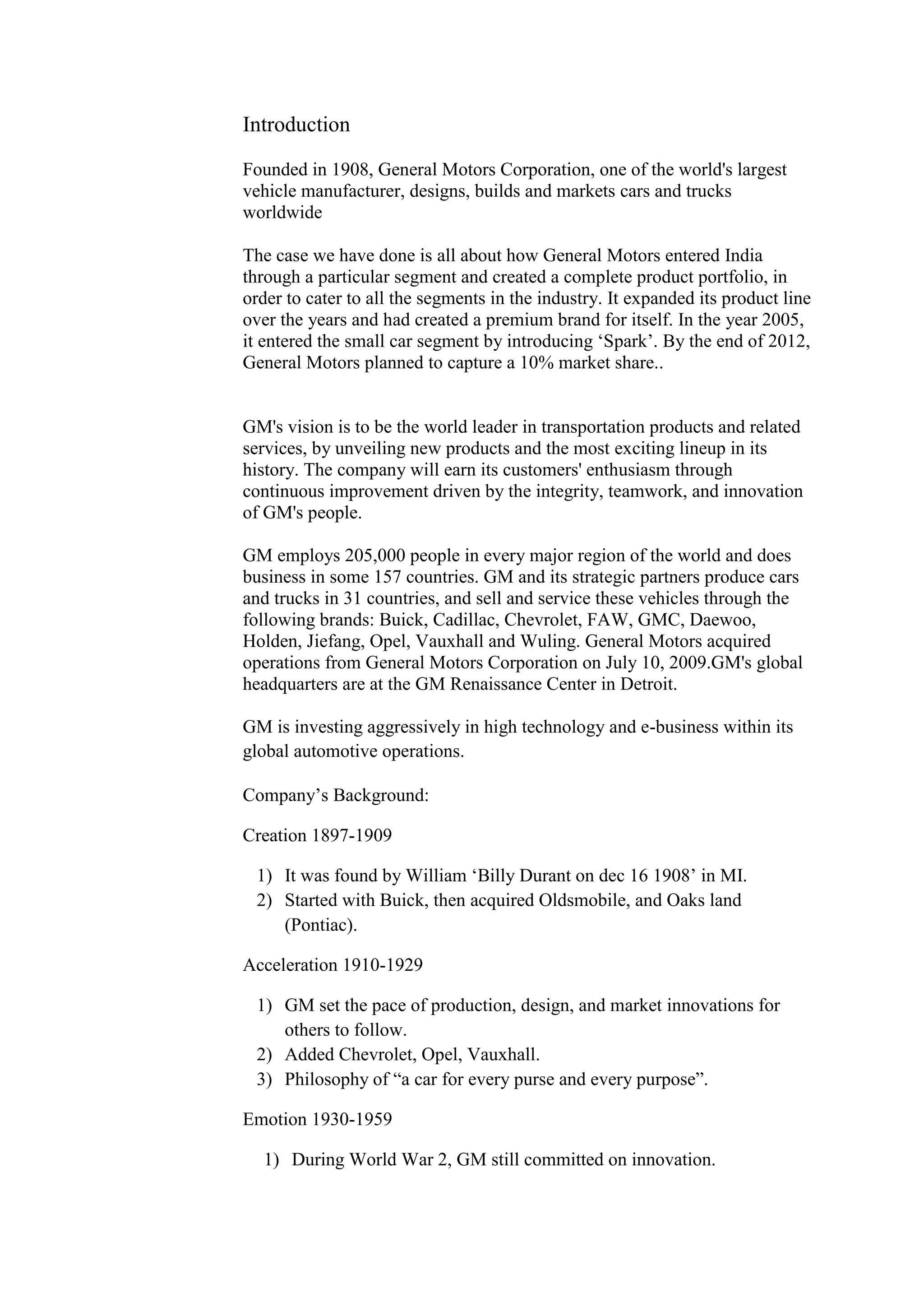 - In India, GM entered through higher segments initially and gradually expanded its product portfolio to cater to all segments. It aimed to capture 10% of the Indian market by 2012.