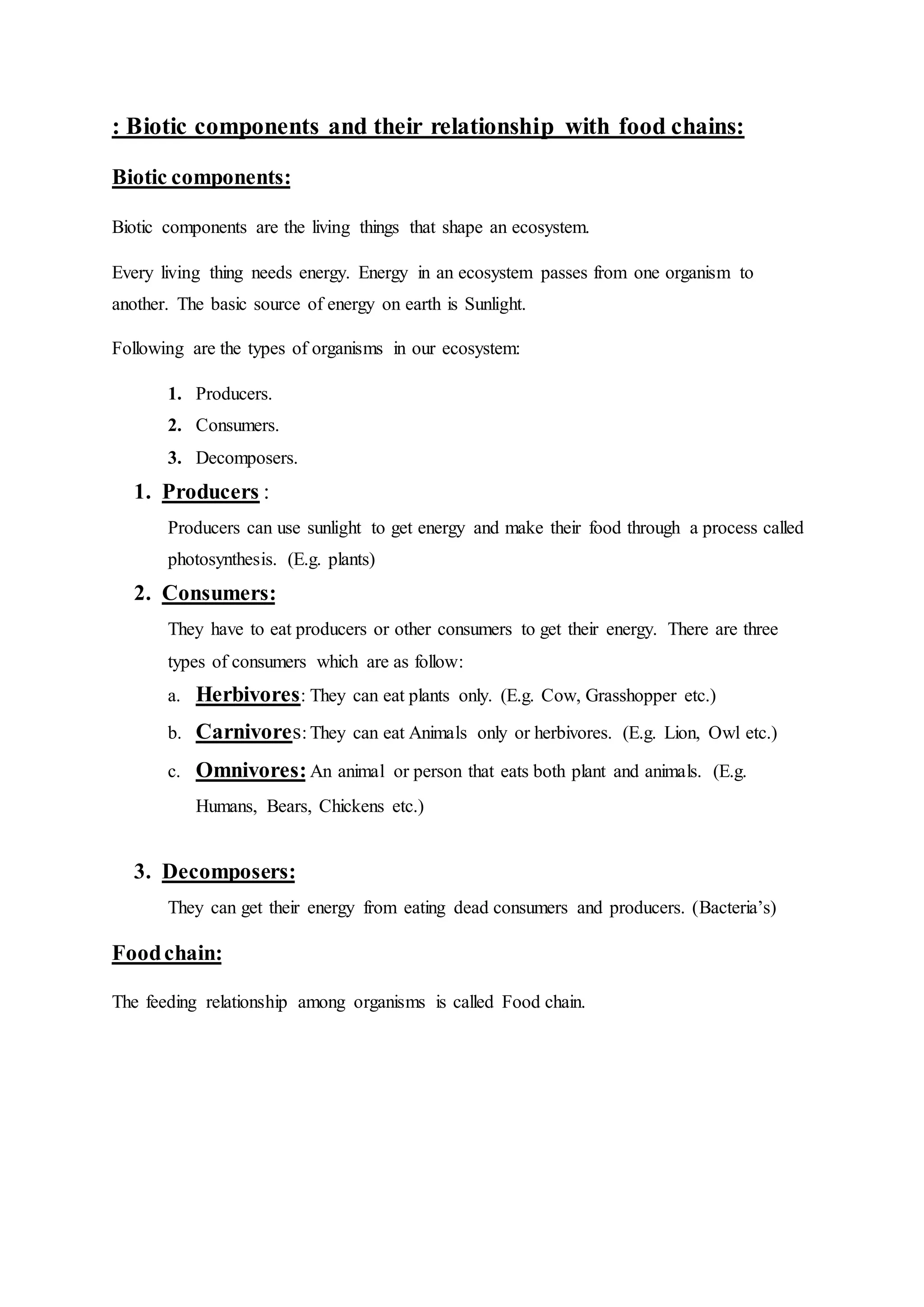 1. Biotic components are the living things in an ecosystem, including producers, consumers, and decomposers.