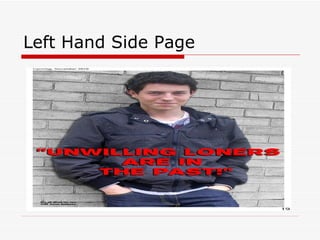 The document discusses design decisions made for a double page spread in a music magazine. For the left page, the artist image was made smaller with a border and page number to relate to the other spread. A glow was removed from the image to make it more natural. A quote was added in red text to continue the continuity from the cover. On the right page, only half an article is shown to be continued on another spread, modeled after conventional magazine layouts. A large image was added beside the text to break up the heavy content. The same font is used for the title and first letter to keep the pages consistent.