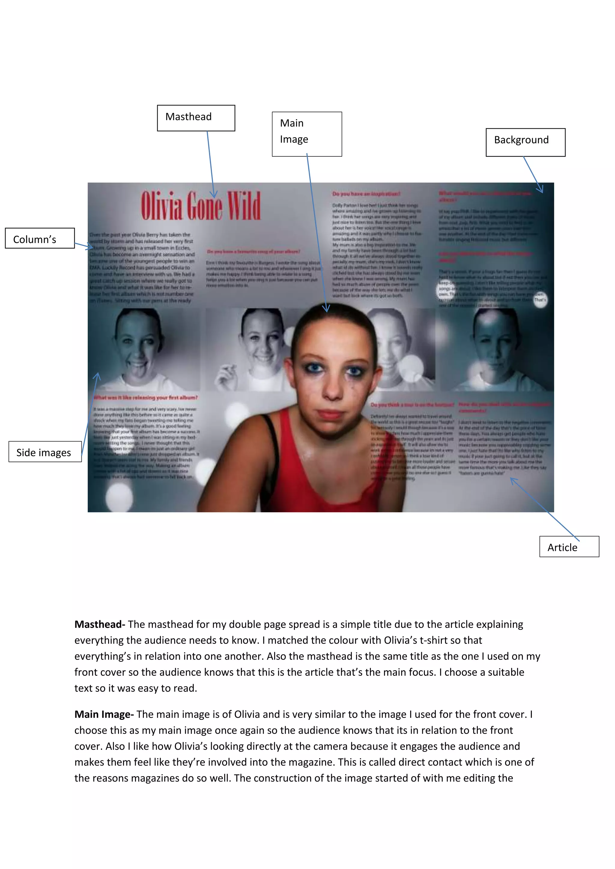 The document summarizes the design elements of a magazine double page spread. The masthead matches the color of the main image's subject and uses the same title as the front cover. The main image features Olivia looking at the camera and was edited to soften edges and lighten her eyes. A blue-tinted background texture was added. Side images of Olivia were resized and arranged, then overlaid on the spread. Columns and an article about Olivia that references other articles were included to structure the text.