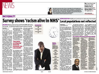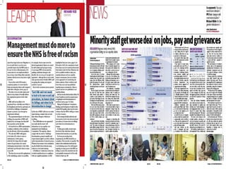The document discusses race equality past, present, and future in the NHS. It summarizes that institutional racism can be detected through unwitting prejudice, ignorance and thoughtlessness that disadvantages ethnic minority people. Current legislation aims to eliminate unlawful discrimination and promote equality. However, evidence shows ethnic minority NHS staff are underrepresented in senior roles and overrepresented in disciplinary actions. Data on ethnic minority patient experiences is also lacking. The NHS BME Network vision is to ensure the NHS delivers on race equality duties through an independent voice for ethnic minority staff, patients, and service users. Changes are needed like eliminating workplace discrimination and ensuring quality care for all.