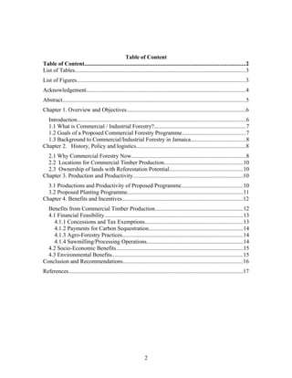 This document proposes establishing commercial timber plantations in Jamaica to increase local lumber production. Over 10 years, 1,000 hectares of pine and 6,000 hectares of various hardwood species would be planted. This would increase pine production by 22,900 cubic meters per year after 20 years and hardwood production by 117,000 cubic meters per year after 30 years, for a total annual allowable cut of 139,900 cubic meters. The proposal analyzes the history of forestry in Jamaica, suitable lands, expected productivity and yields, financial feasibility, and environmental and socioeconomic benefits of establishing commercial timber plantations.