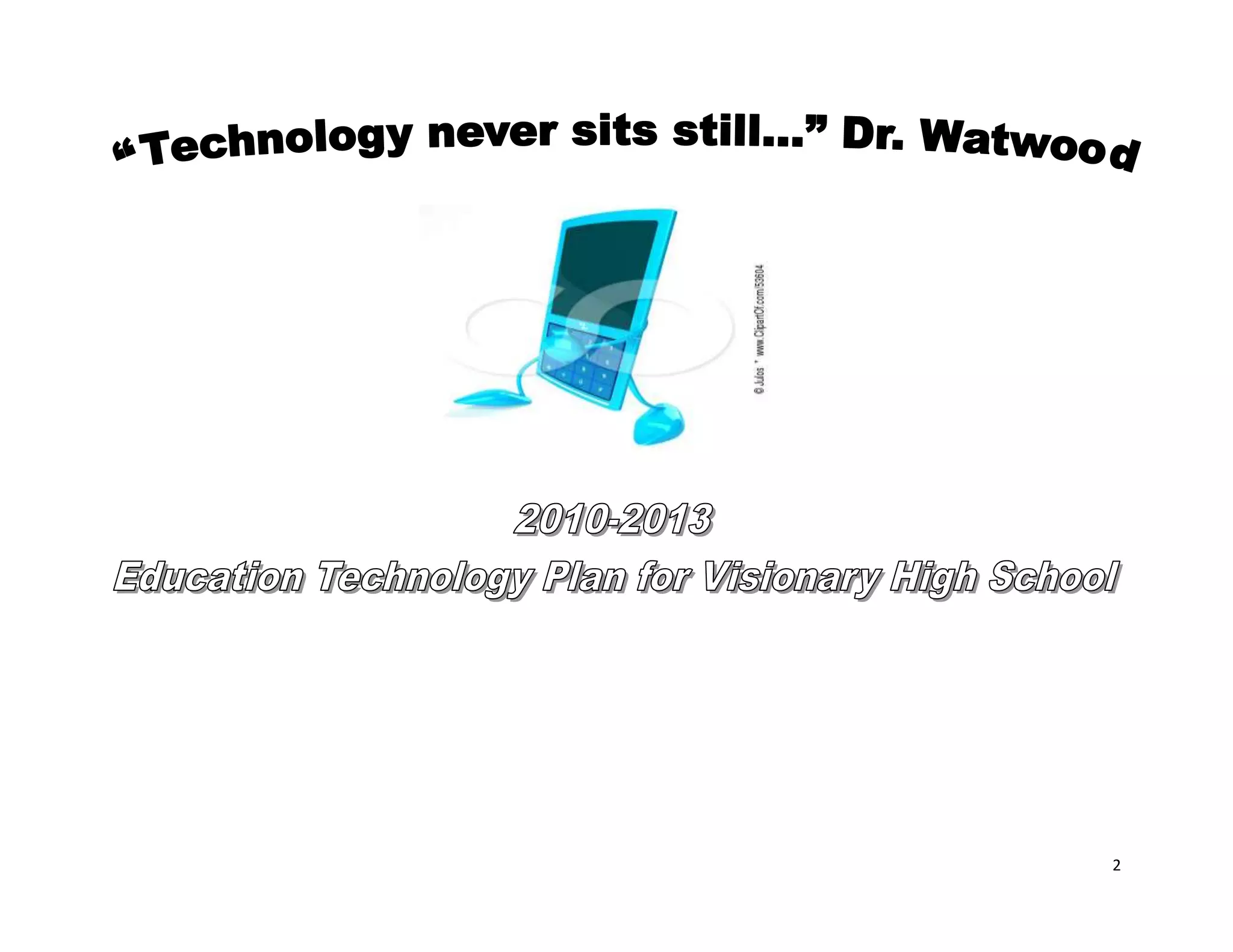 The document provides a technology development plan for Visionary High School with the goal of ensuring equal opportunities for students to learn in a safe environment using innovative technologies. It discusses focusing on infrastructure, teaching, learning, assessment, and productivity. The plan outlines strategies and timelines for improving internet access, a one-to-one laptop initiative, and professional development for teachers on integrating technology into the curriculum.