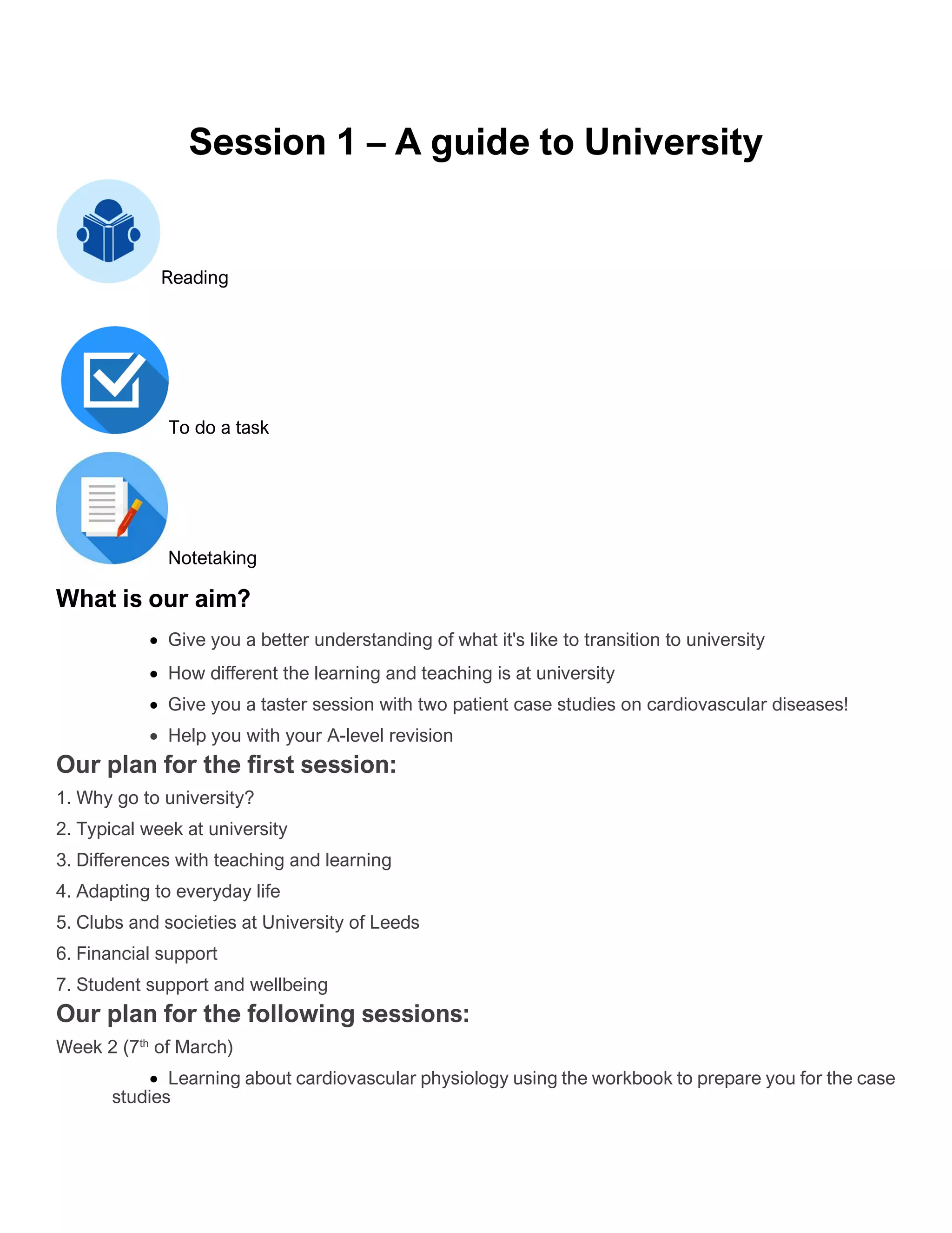2. An outline of the session topics which include university life, clubs/societies, financial support, and future case study sessions on cardiovascular physiology and diseases.