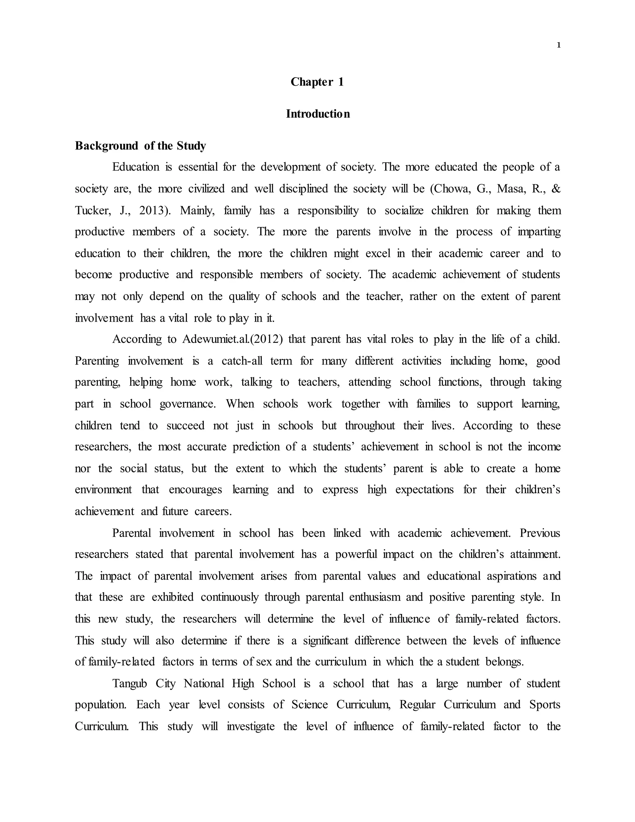 This document provides background information and context for a study on the level of influence of family-related factors on students' academic performance. It discusses how parental involvement is important for children's success in school. The study will focus on 4th year students in the Sports curriculum and Science curriculum at Tangub City National High School. The theoretical framework discusses how social cognitive theory and previous research have shown parental involvement contributes to academic achievement. The research methodology section outlines the descriptive research design that will be used to determine differences in influence based on sex and curriculum.