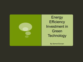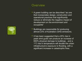 Buildings are responsible for 23% of Australia's greenhouse gas emissions. Investing in green technology and building design can significantly reduce this environmental impact. The document discusses how a green building incorporates practices to reduce its negative impact. It also outlines existing voluntary and mandatory approaches for improving energy efficiency in the built environment. The author suggests alternatives like an energy efficiency trading scheme could help lower emissions from buildings.