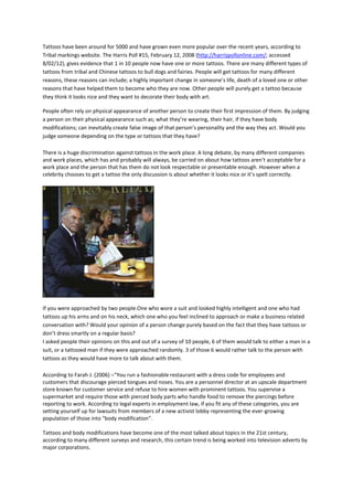 The document discusses body art from several perspectives, including tattoos, gang culture body art, and tattoo addiction. It examines the symbolic meanings behind gang tattoos, such as representing gang membership, ranking within a gang, or memorializing fallen members. Tattoo addiction is explored from both physiological and social standpoints, such as the adrenaline rush or endorphin release from the tattoo process, or using tattoos as a means of self-expression or to gain attention. The document also considers the discrimination faced by tattooed individuals in workplace settings.